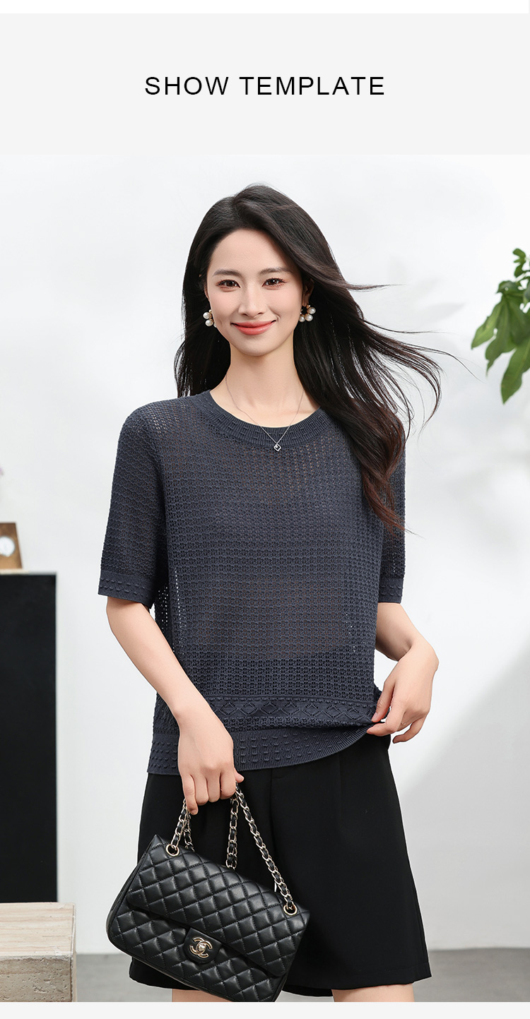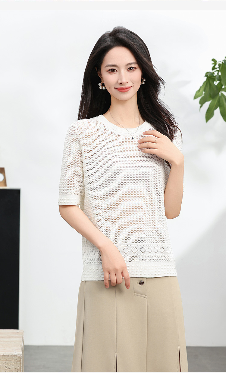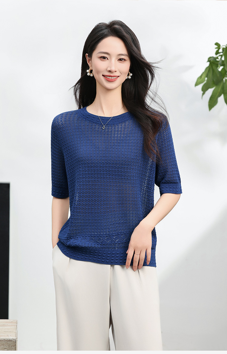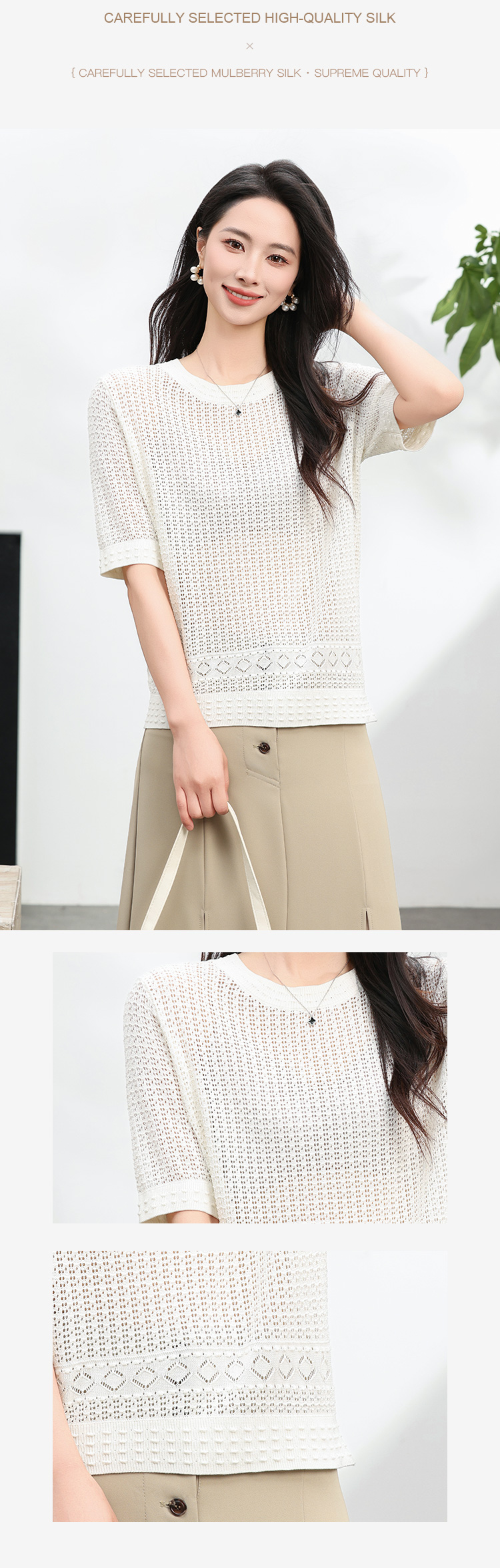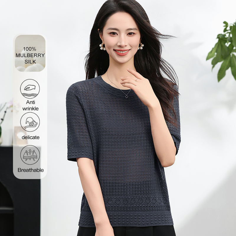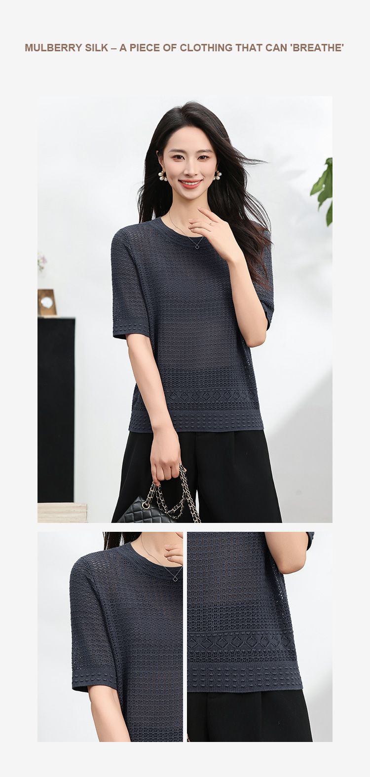 Mumeng [100% Mulberry Silk] Size 25 캐주얼 숏슬리브 홀로우아웃 여름 여성용 니트 탑(カジュアル ショートスリーブ ホローアウト サマー レディース ニットトップス) – YTNL5619T